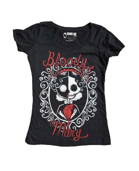 This short sleeve Akumu Ink scoop neck features hand-drawn artwork of the folkloric ghost tale of Bloody Mary. If you say her name three times in front of a mirror she will appear behind you.