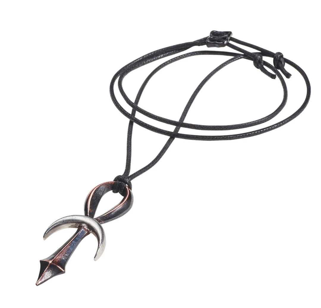A bronzed pewter gothic ankh pendant, with its horizon bar made in the form of a polished pewter silver crescent moon.