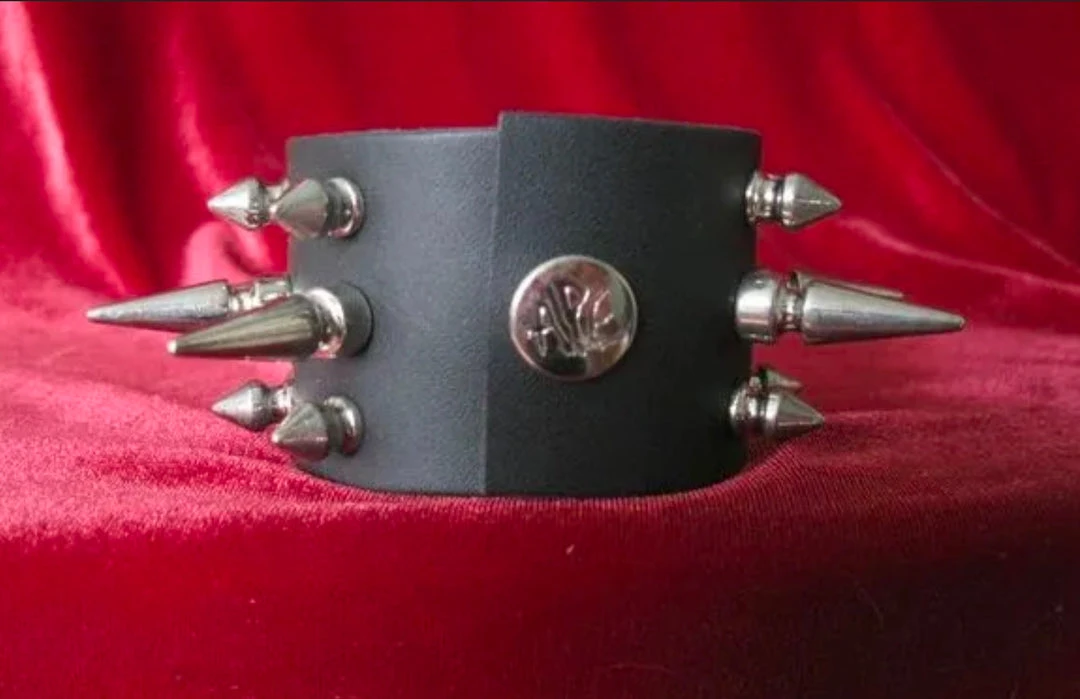 High quality leather wristband with 2 rows of 5/8″ spikes and 1 row of 1″ spikes.