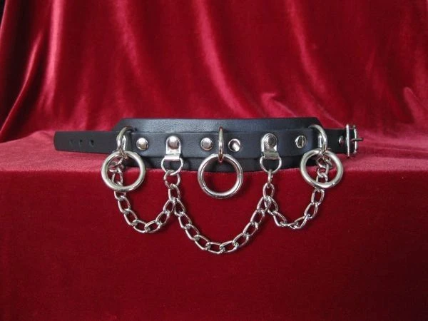 High quality 3-ring bondage wristband with chain. 1.25″ wide. Buckle fastener with 3 adjustments at .5″ increments. Size shown is the middle hole of the three.