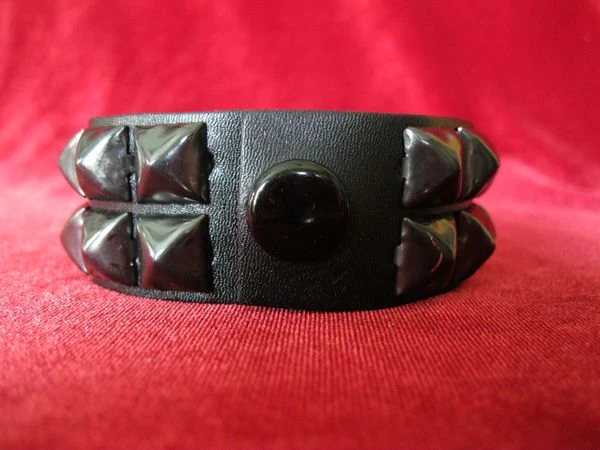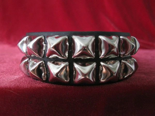 Two row pyramid wristband on black leather with bright nickel 1/2″ pyramids. by Ape Leather. Choose from black or silver.
