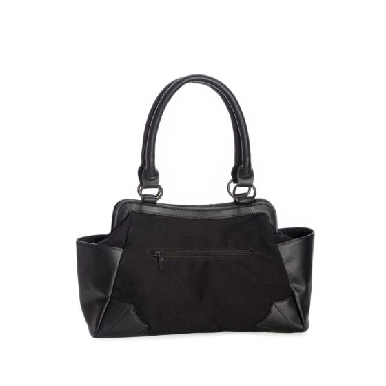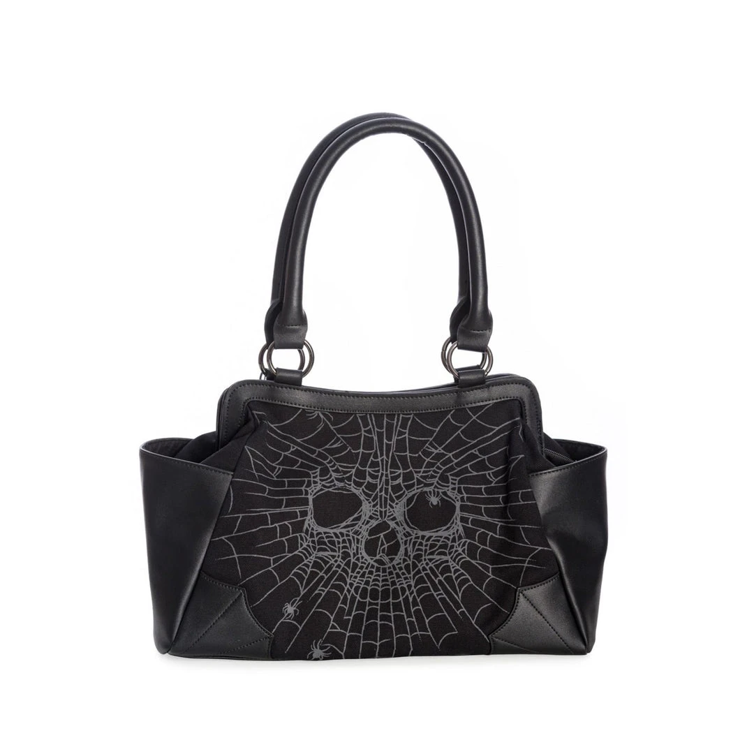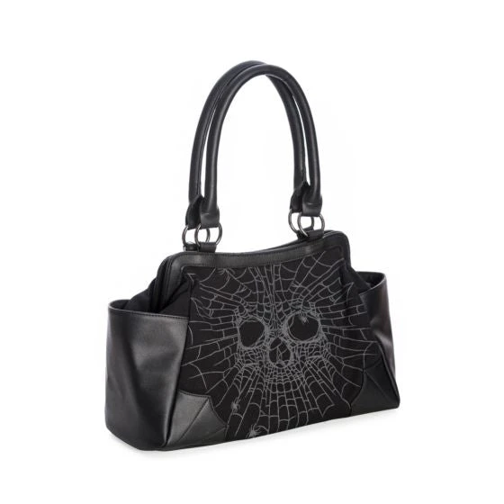 Black handbag featuring a spiderweb skull face.