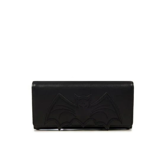 The black bat wallet features an embroidered bat on the outside with 12 card slots, an ID holder, a zipper change pocket and 4 large pockets.and a snap closure.