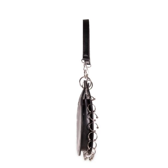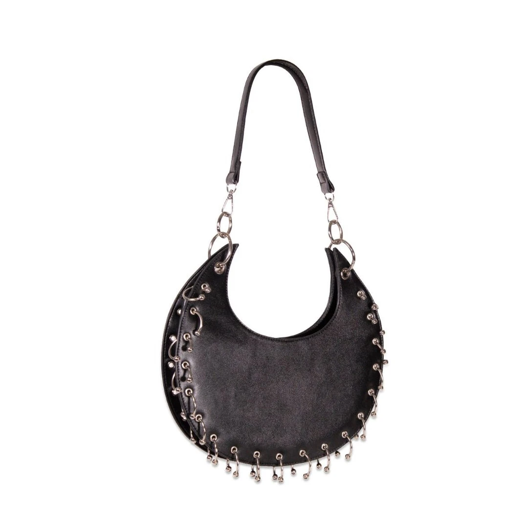 Black crescent moon-shaped handbag with crescent ring accents.