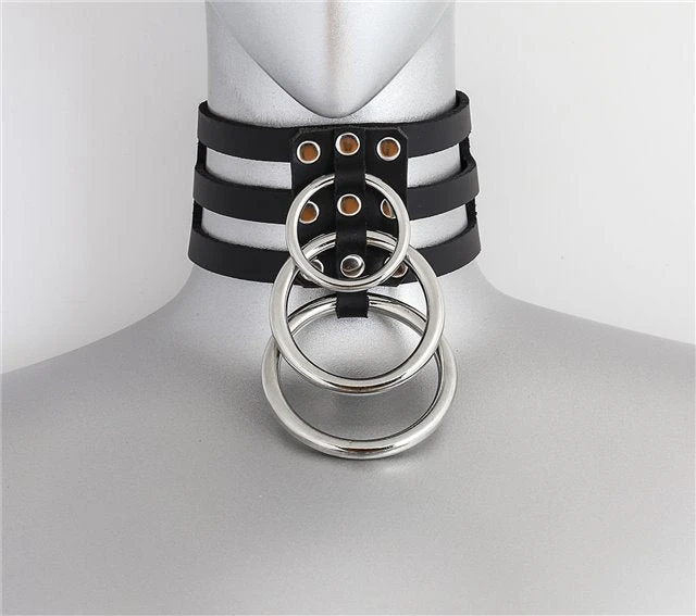 Three straps, with three silver bondage rings, on thick, solid, genuine, black leather.