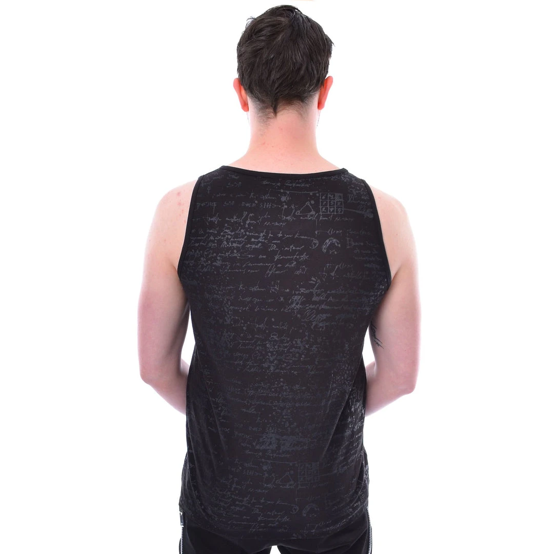 The Pentagram vest is a black sleeveless tee with an all-over black silk-screen print on the front and back. The front features a pentagram with a goat’s head skull at the center.