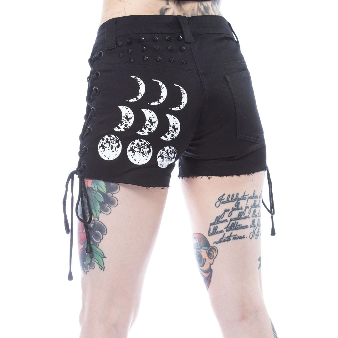 Moonchild shorts in black by Heartless. Features black cone studs, lace-up sides, and moon phases on the front and back.