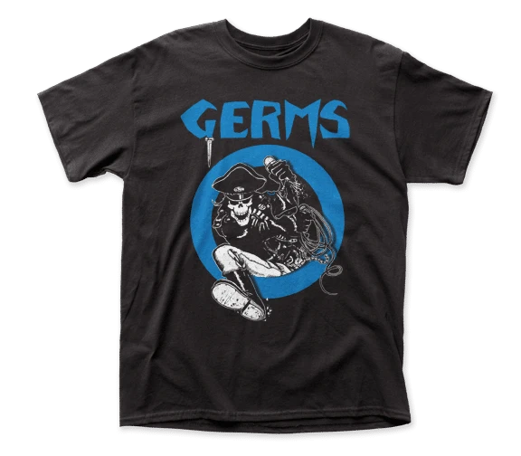 The Germs Leather Skeleton design on a black t-shirt.