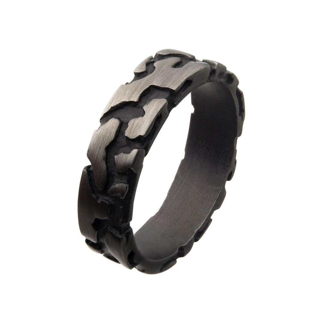 Men’s Matte Stainless Steel Gun Metal Plated with Terra Pattern Band Ring.