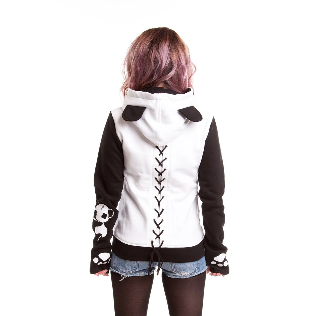 Panda ears on hood. Lace-up panel on back. Front zip fastening. Contrast sleeves with thumb holes, paws and panda print.