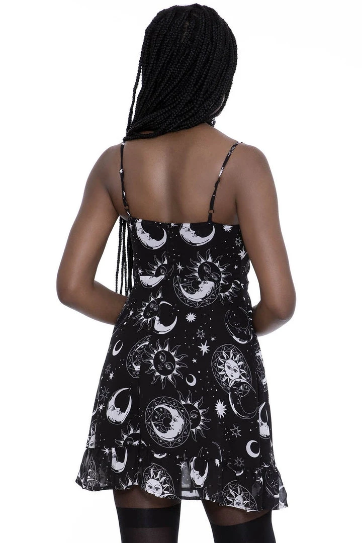 Dreamy and seductive, the ‘Astral Light’ sundress is your perfect partner for dusk or dawn. In a soft-flowy chiffon fabric for perfect comfort and fit. Featuring an open neck with thin shoulder straps, lace-up front detail and zipped back for easy on/off. Adorned with a contrasting sun & moon pattern. Versatile and easy to style – fully lined of course.