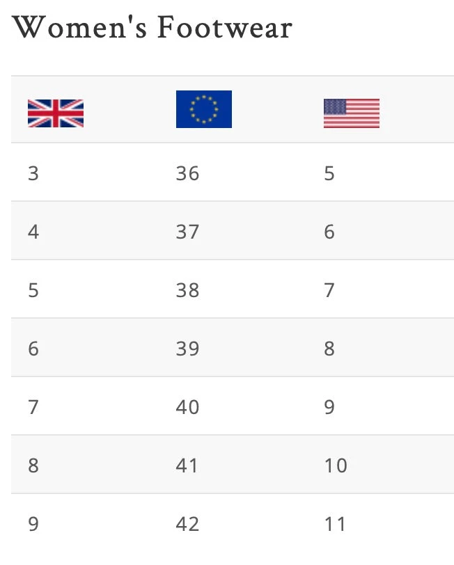 Sizes are US Women’s.