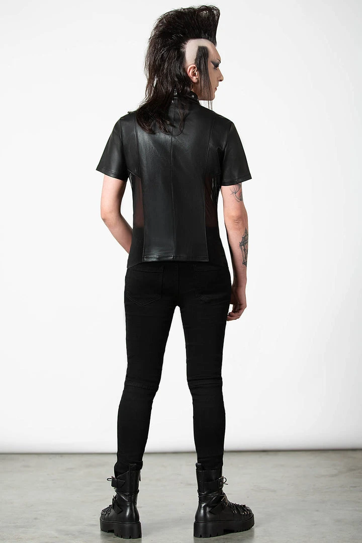 Feel like a god in our ‘Oberon’ zip top. Crafted in luxe, vegan leather with mesh side panels to give the perfect fit. Finished with a high neck, full length zip and collar detail, this is a perfect staple for any ethereal wardrobe.