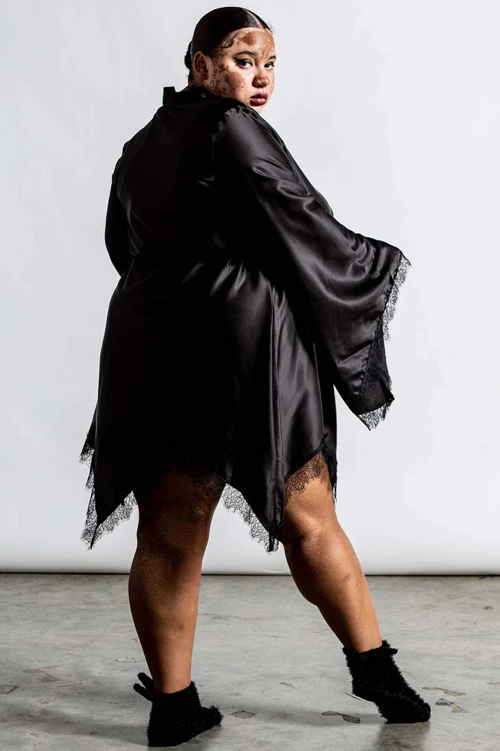 Add some dark glam to your adventures with the ‘Devil’s Lullaby’ satin robe – in a super soft satin fabric, with long sleeves, open front, and lace tie. Decorated with delicate lace trims and hanky hems. A seductive must-have – pairs beautifully over lingerie sets or just your birthday suit.
