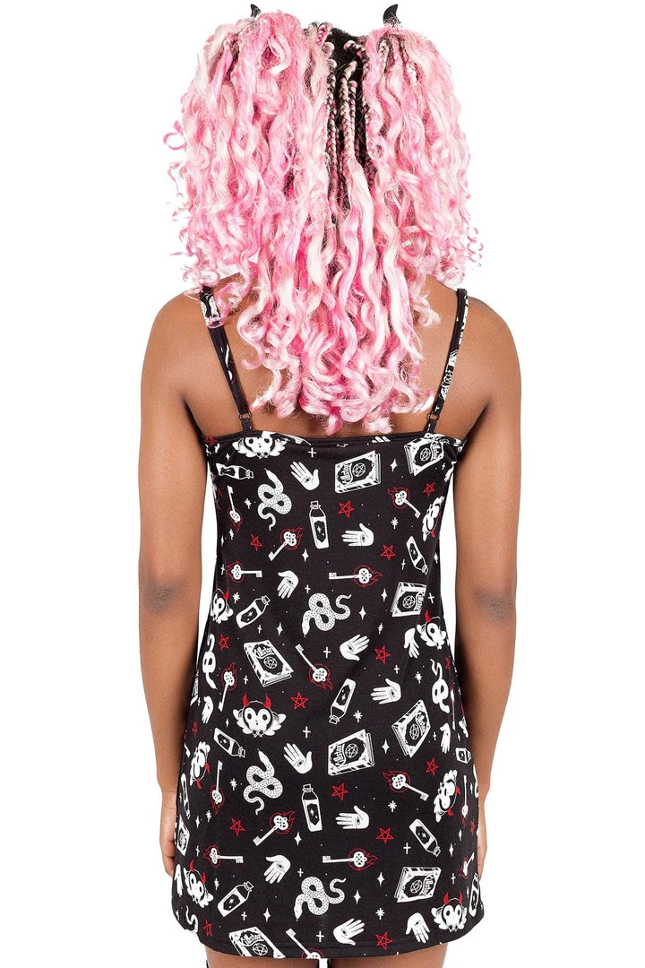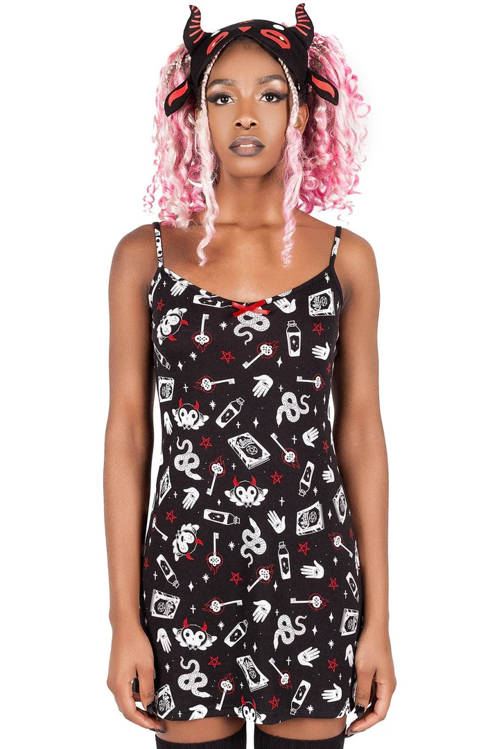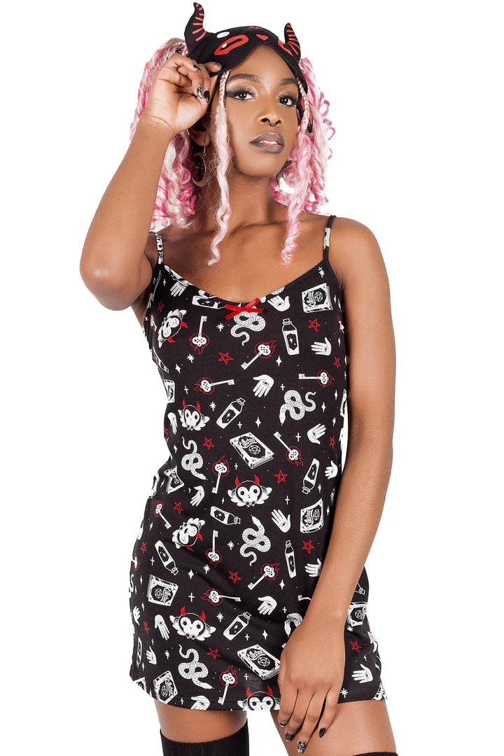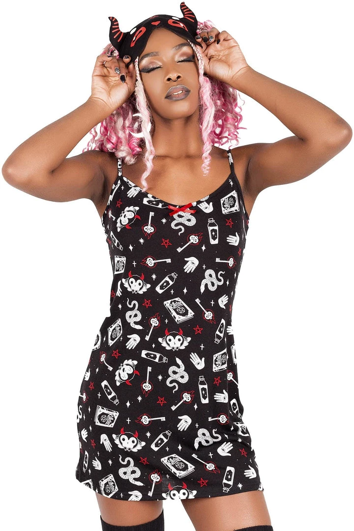 Get down and cozy with the ‘See U In Hell’ sleep dress; featuring a fitted body with lace trims in a super-soft fabric with just the right amount of stretch – for perfect comfort and fit! Statement contrasting print all over, thin straps and easy to wear from dusk to dawn.