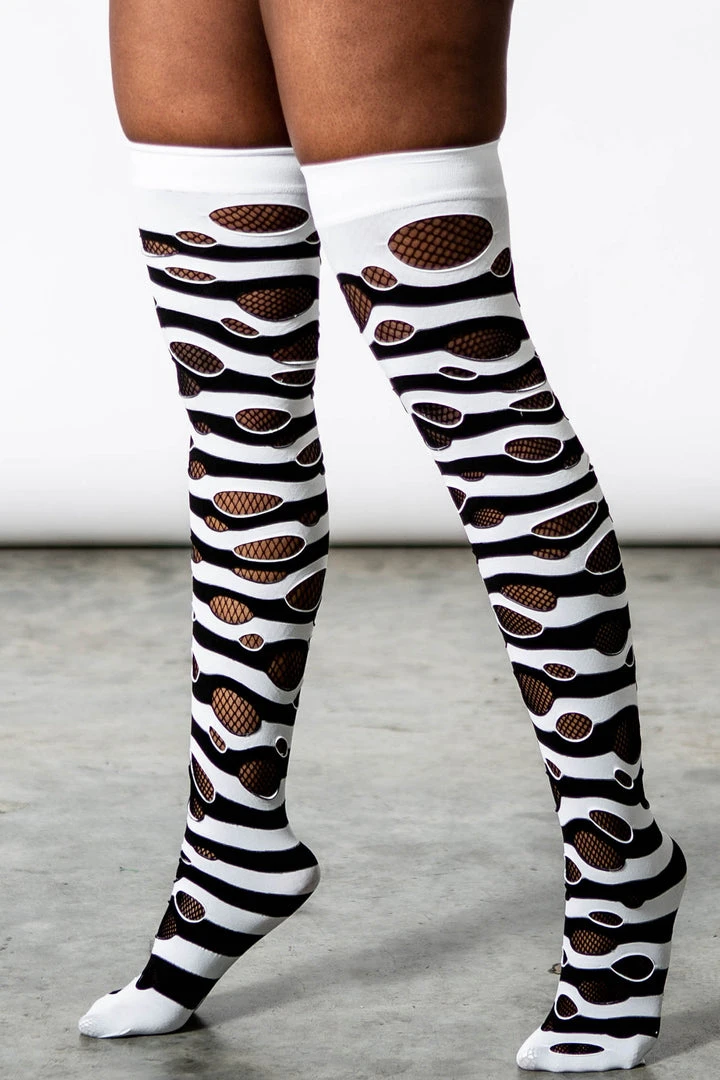 When all else fails, get new socks! Classic and exxxtra long socks – ‘Wretched Soul’ distress socks featuring contrast stripes and thigh-high look. With distressed details all over.