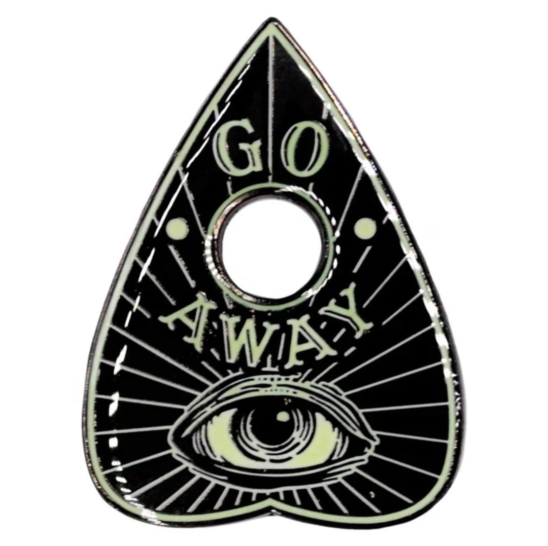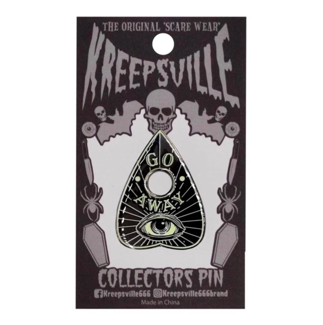 Kreepsville 666 skeleton planchette enamel pin badge, gloss finish with eerie glow in the dark effect.