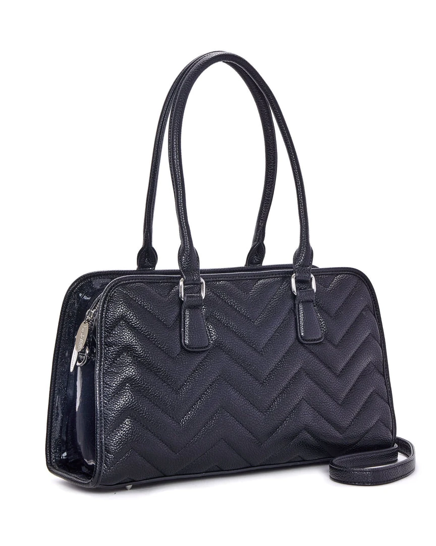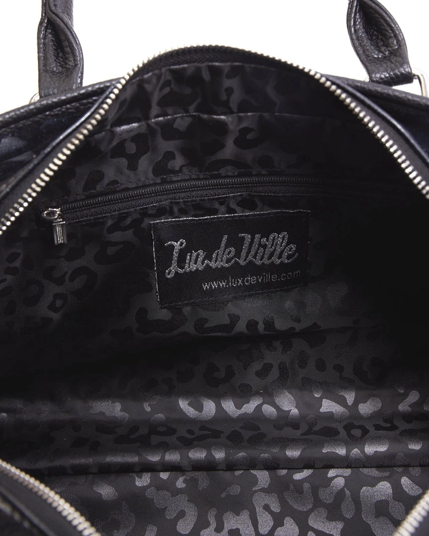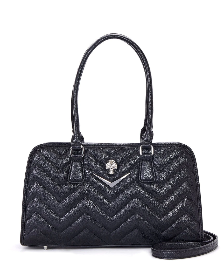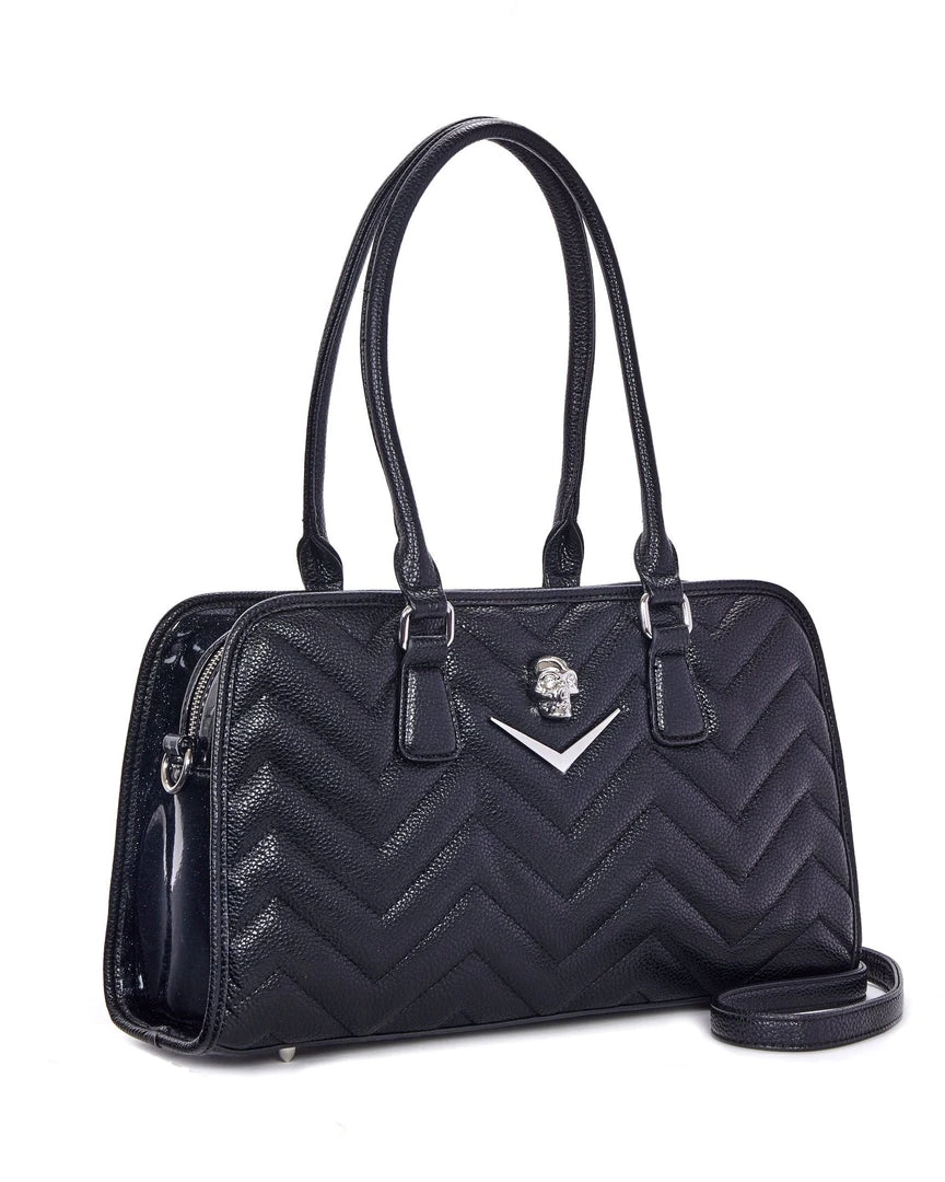 Our new Hellraiser Totes are deliciously dark. They feature our all over chevron stitching and our skull and chevron hardware. Inside is lined with black on black leopard with a zipper closure pocket and silver bullet feet on the bottom. Also comes with a detachable and adjustable crossbody strap. These are large enough to carry all your gothic goodies for day and night.