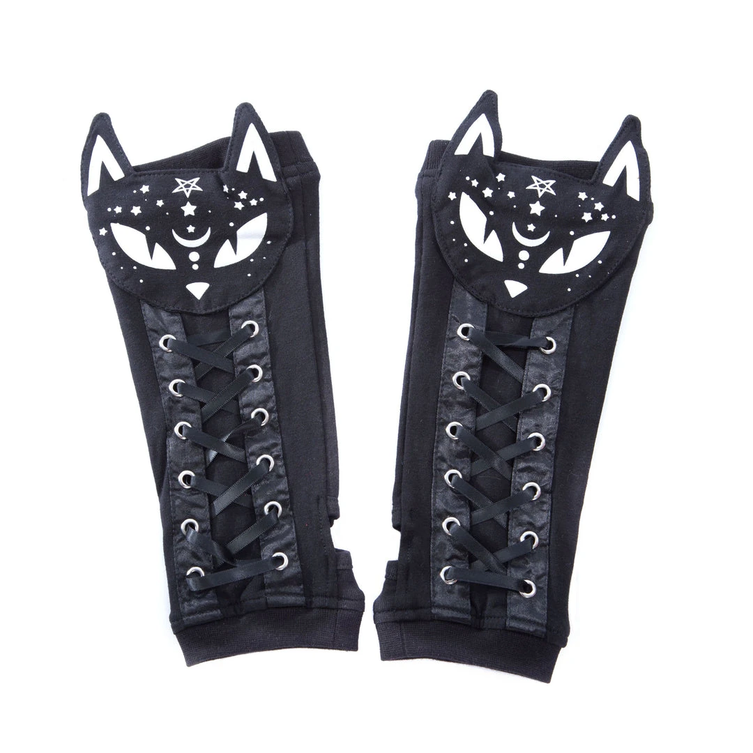 Dark kitty armwarmers by Poizen Industries. Features a cute cat face and laced up arm.