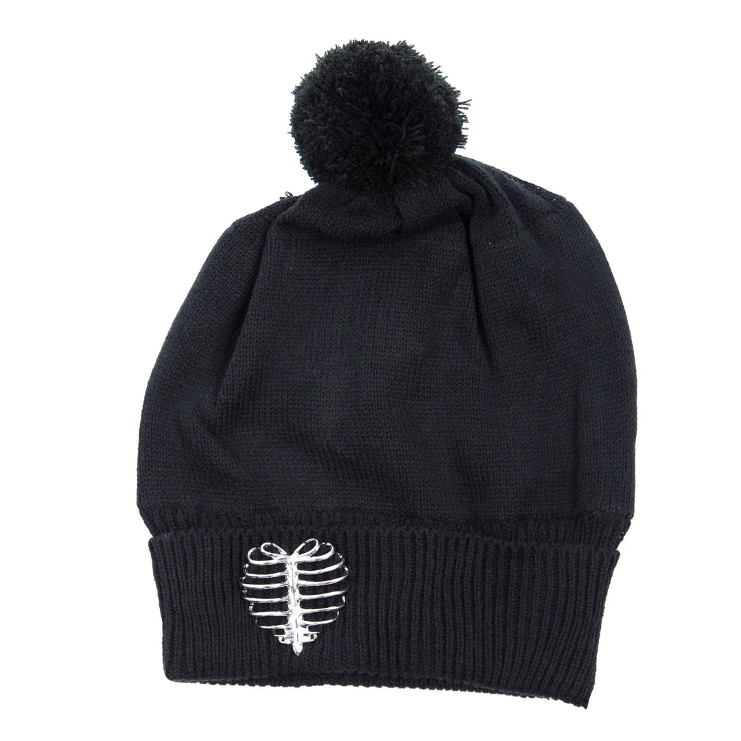 The Rayne Hat from Poizen Industries feature a pom pom on top and metal ribcage stitched to the front, the hat is cozy and cool.
