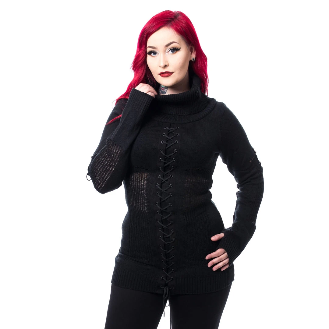 Women’s knit sweater featuring front and back lace-up accents, and D-ring accents on the sleeves.