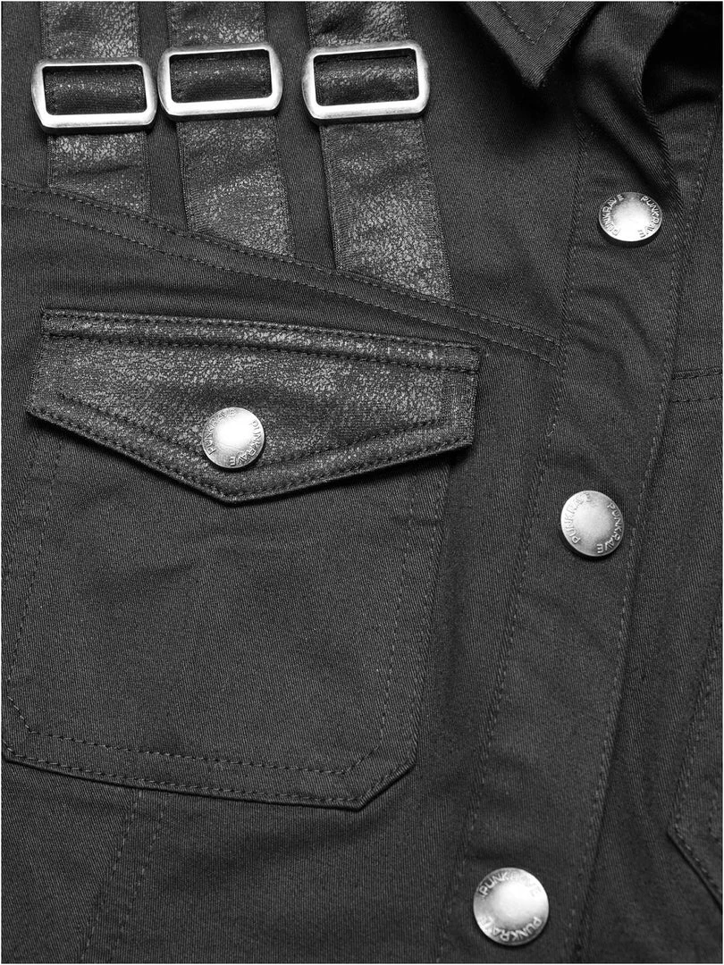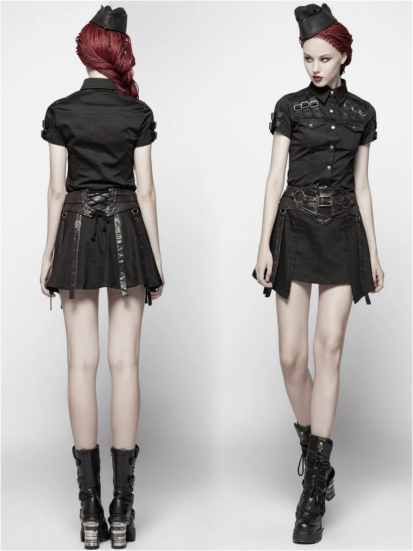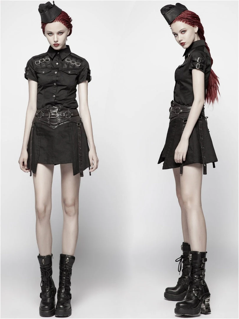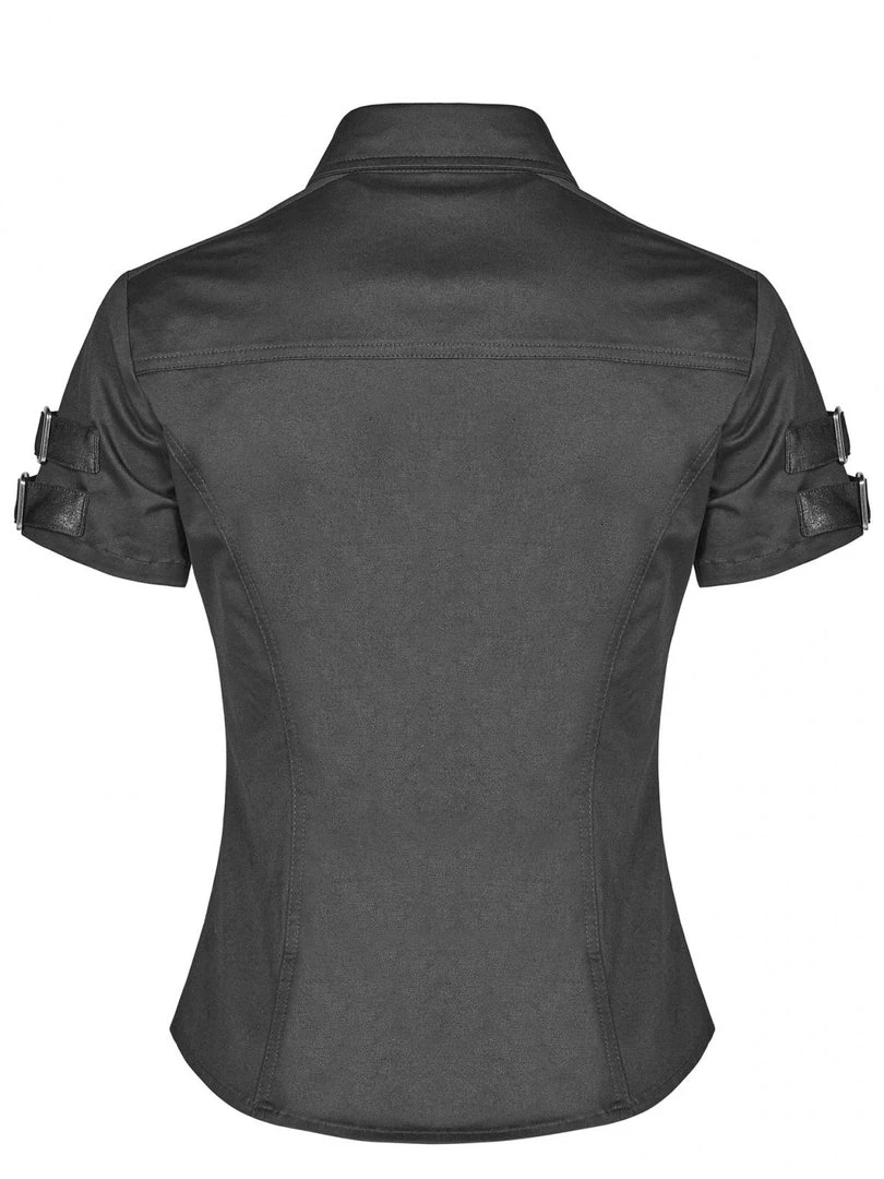 Gothic Militia shirt by Punk Rave. Gothic Military style women’s black short-sleeved shirt decorated with synthetic leather imitating fabric buckled straps on the chest and sleeves. Press studded front closure.