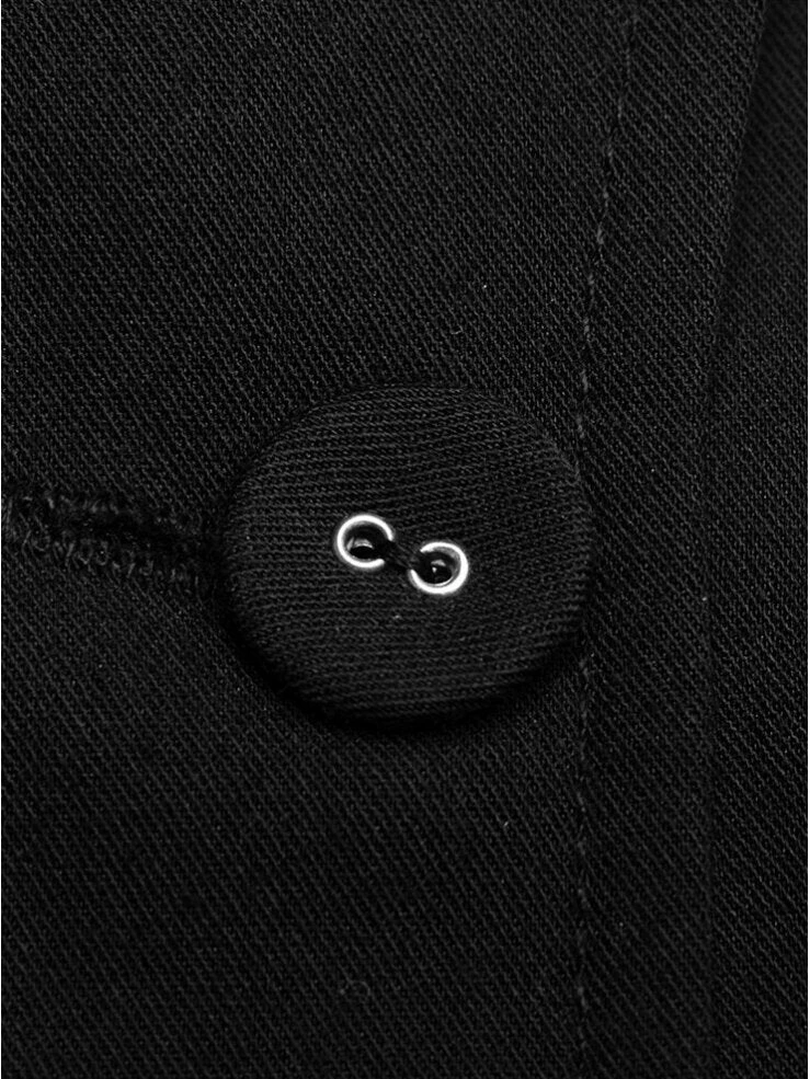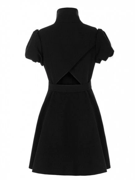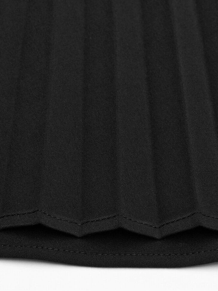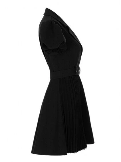 Pleated Shirt Dress is made from fine textured black woven fabric to reduce crinkling. Suit-style open lapel neckline. Puff short sleeves.