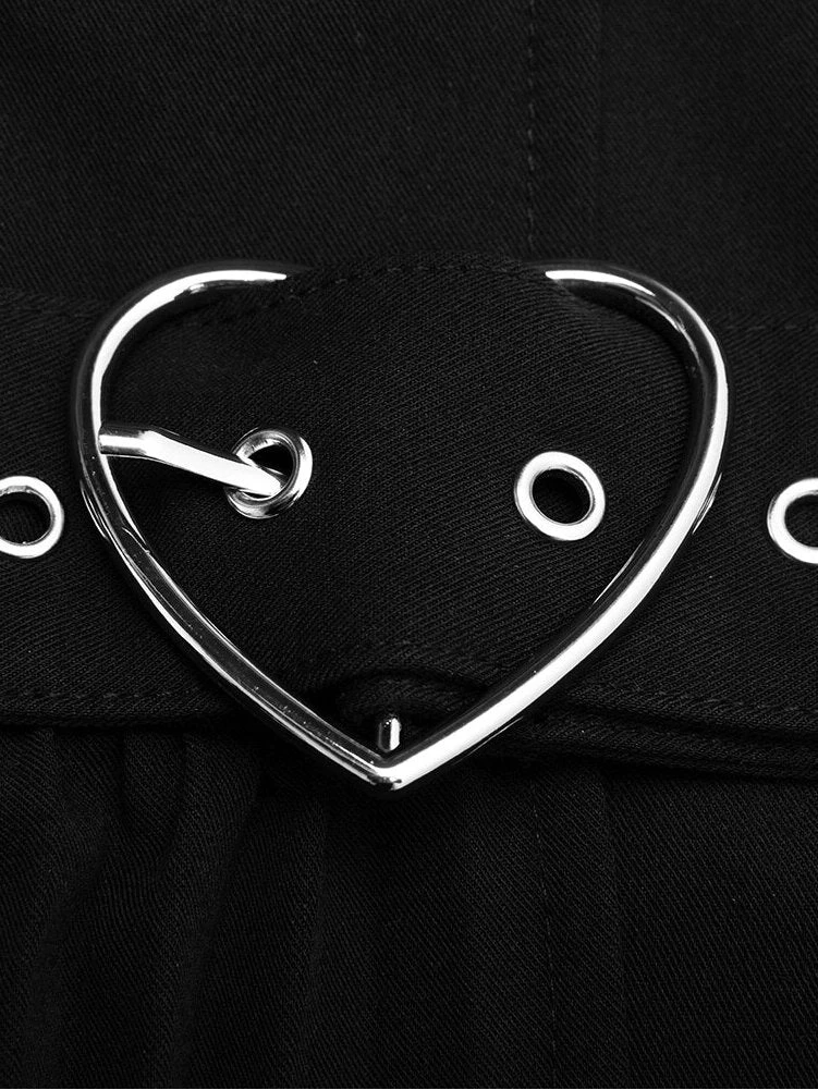 Material covered buttons down center front. Adjustable belt at waistline with heart-shaped belt buckle decoration.