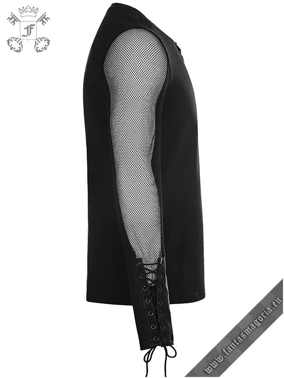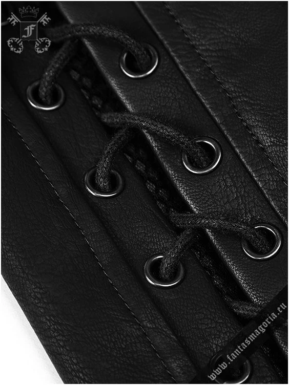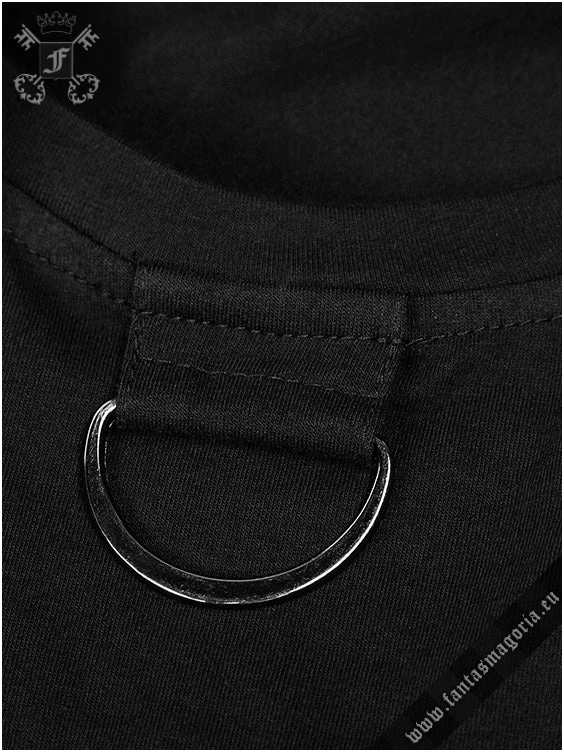 Gothic Industrial style longsleeve tight-fit top with hood, made of stretchy comfortable cotton, stretchy mesh-net and decorated with vegan leather. Synthetic leather laced details on the writs imitate long wristbands. Large D-ring on the collar. Transparent mesh details on the outer side of the sleeves, down the shoulder.