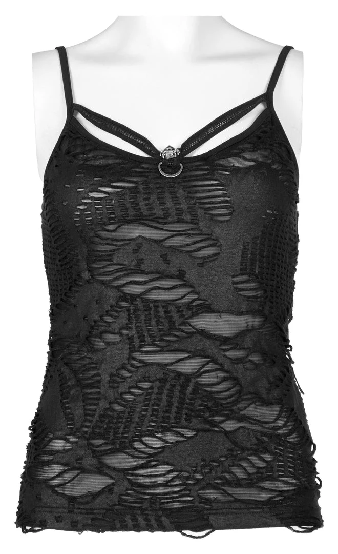 Black camisole tank top from Punk Rave. Textured, ripped top is made from a soft elastic fabric featuring skull accent on the front and adjustable shoulder straps.