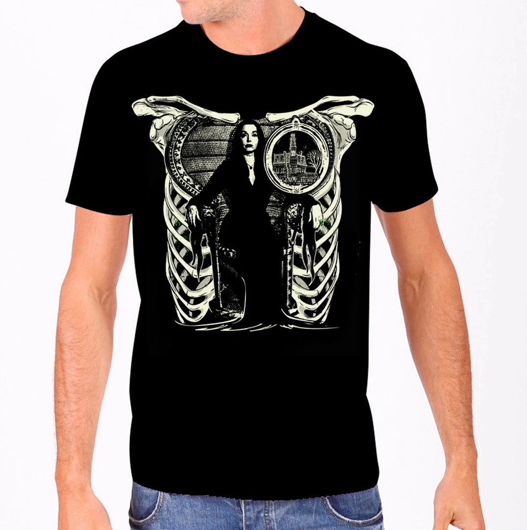 Morticia Addams t-shirt with high-quality graphic printed on slightly fitted sturdy but breathable material. This graphic is owned by Rock Rebel only!