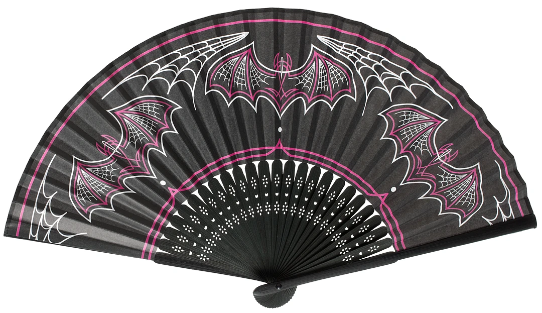 Our Batty Pinstripe hand fan is designed to bring you a little breeze and take you away to a pinstriped paradise. Even better, this little work of art folds accordion-style for ease of carrying, and unfolds to reveal an intricately pinstriped bat & web design, printed in pink & white on an all-black fan.