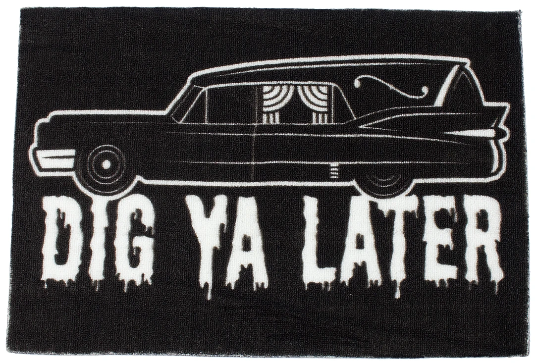 We’re always looking for ways to impart our morbid sensibilities to your haunted home, and our Hearse Rug will do just that! Featuring a durable tight-loop topside and non-skid underside, this small rug is perfect for adding a deathly touch to your entryway, bathroom, bedroom or just about any indoor space you see fit. Even better, this design is one of our favorites ever, featuring an homage to your final ride to the other side with this retro Death Cab. Grab yours and we’ll Dig Ya Later!