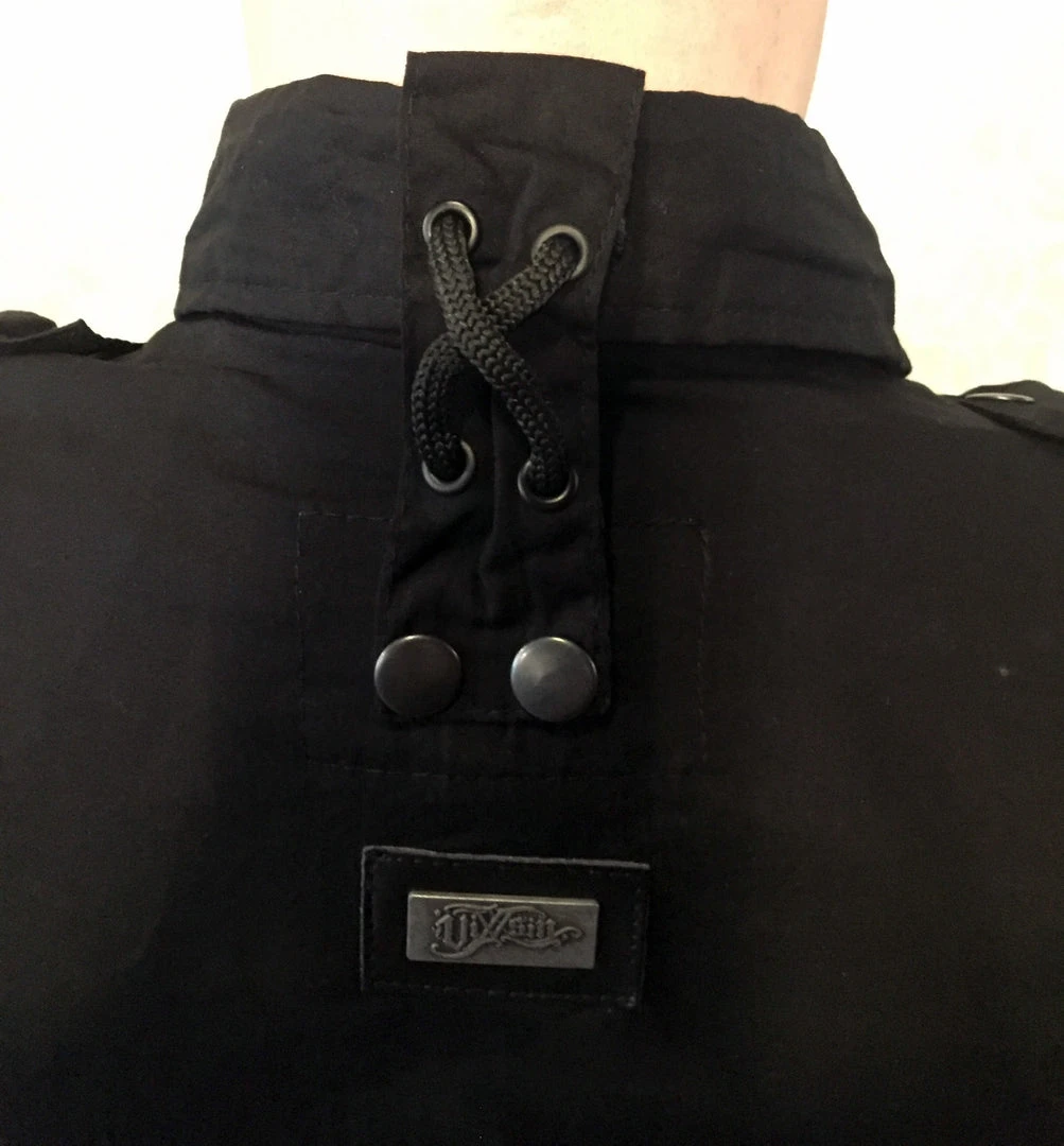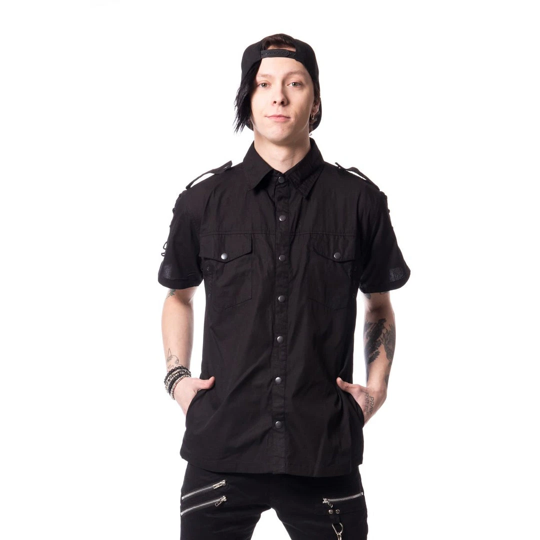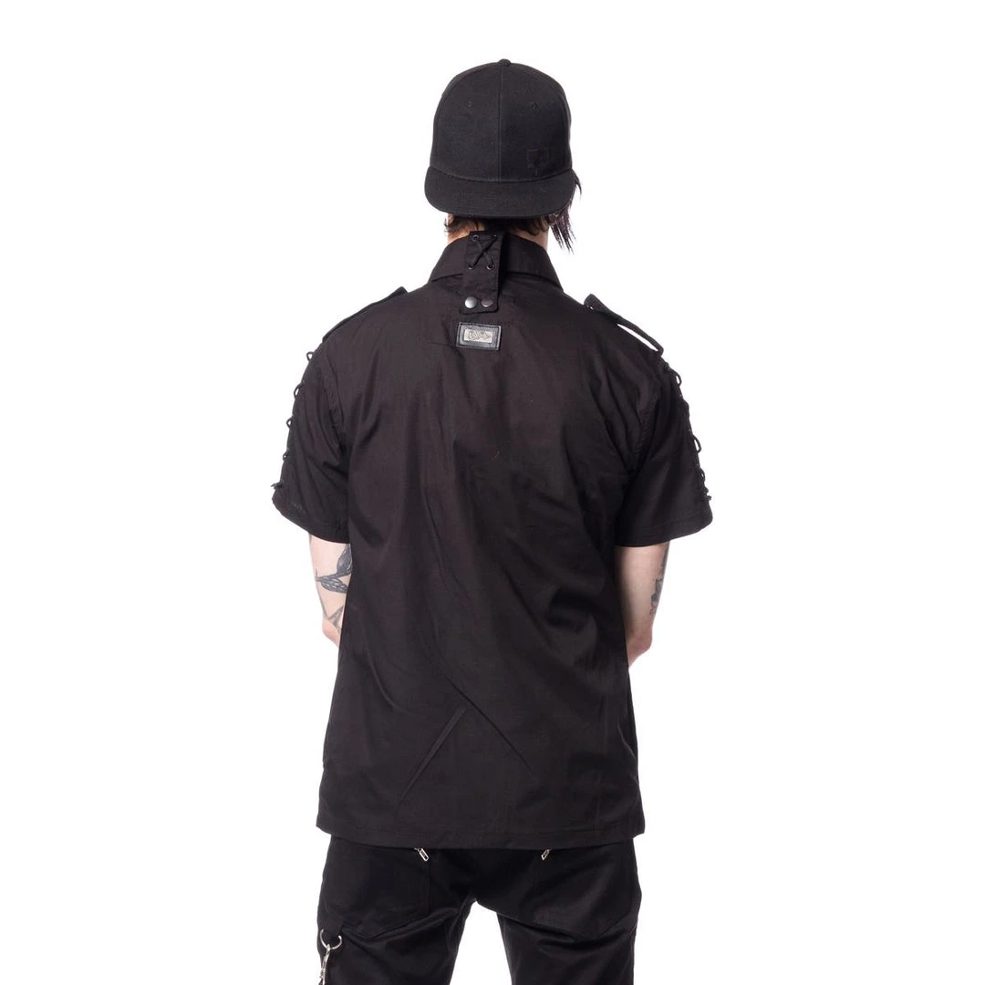 Fitted black shirt with black snap buttons, side pockets, black laces up the sleeves and collar, and black eyelets on the chest pockets.